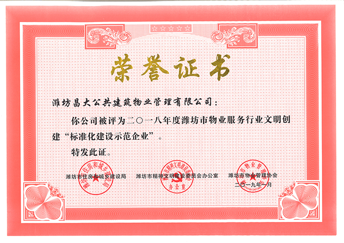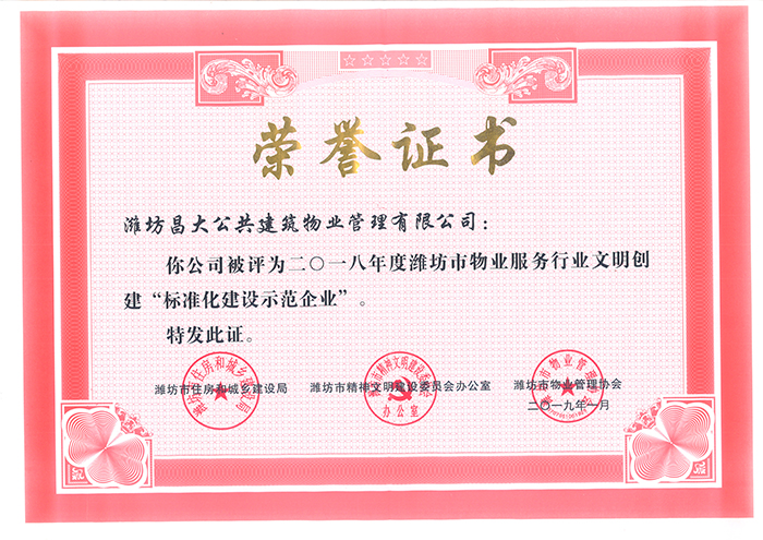 2018年2月被評為全省物業(yè)行業(yè)文明創(chuàng)建標(biāo)兵企業(yè)