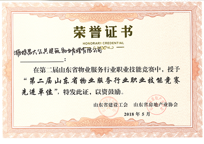 2018年5月被評為第二屆山東省物業(yè)服務(wù)行業(yè)職業(yè)技能競賽現(xiàn)進(jìn)單位