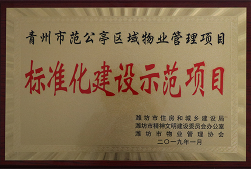 2019年1月青州市范公亭區(qū)域物業(yè)管理項(xiàng)目被評為“標(biāo)準(zhǔn)化建設(shè)示范項(xiàng)目”。