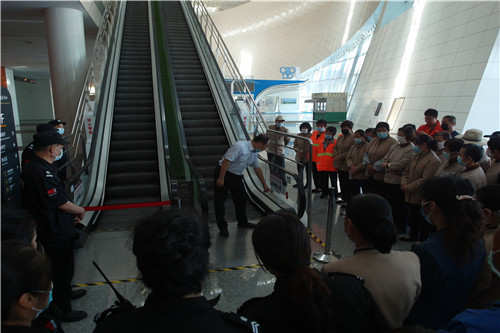 上圖為現(xiàn)場(chǎng)講解自動(dòng)扶梯的工作原理及緊急處置方法